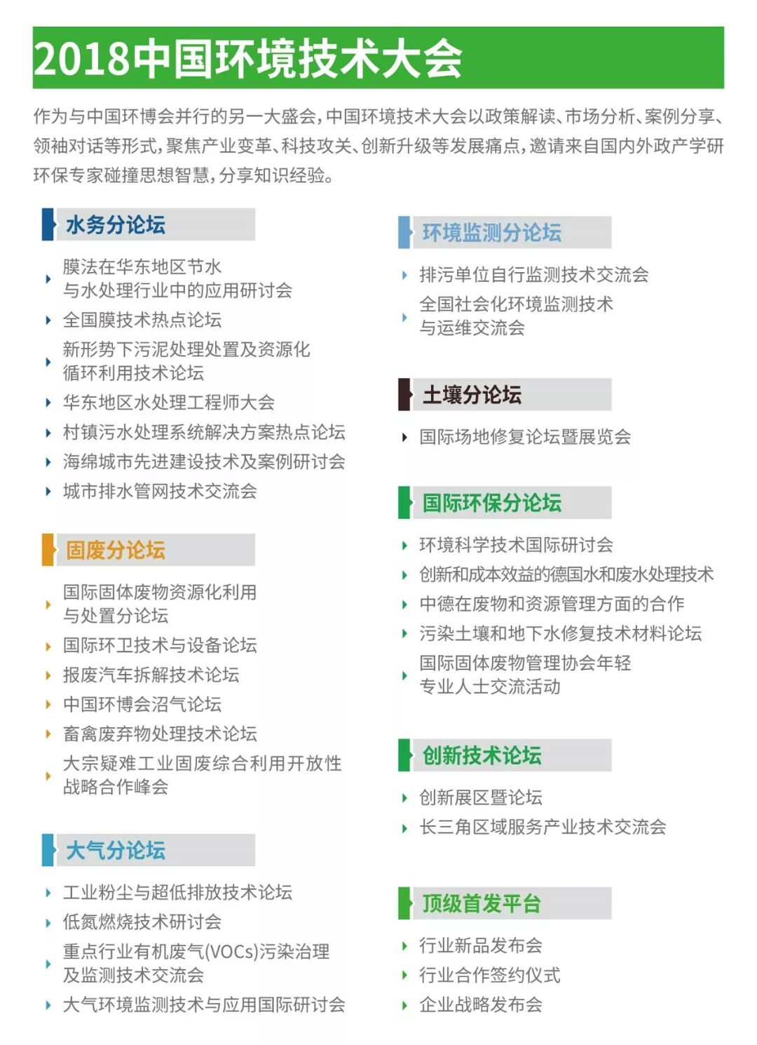 中国环博会秉承全球最大环保展慕尼黑IFAT展的卓越品质,深耕中国环保产业19年,已成为仅次于IFAT展的全球第二大环保展,是亚洲最大的环境技术展示交流盛会。展会覆盖水、大气、固废、土壤四大污染领域,集中展示市政、工业、农村环境治理高效解决方案,成为全球领军环保企业的展示交流平台。